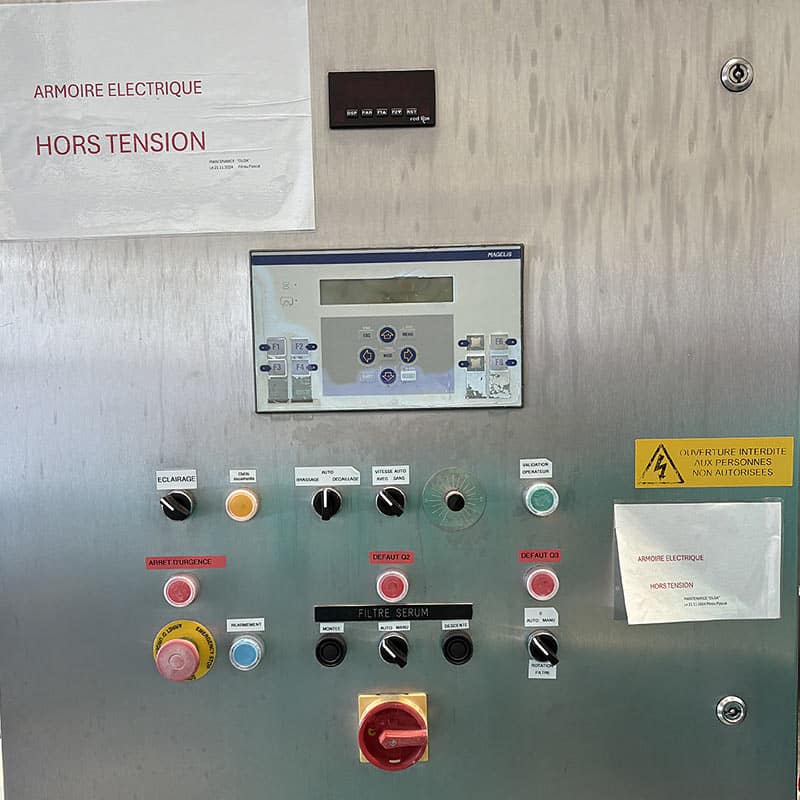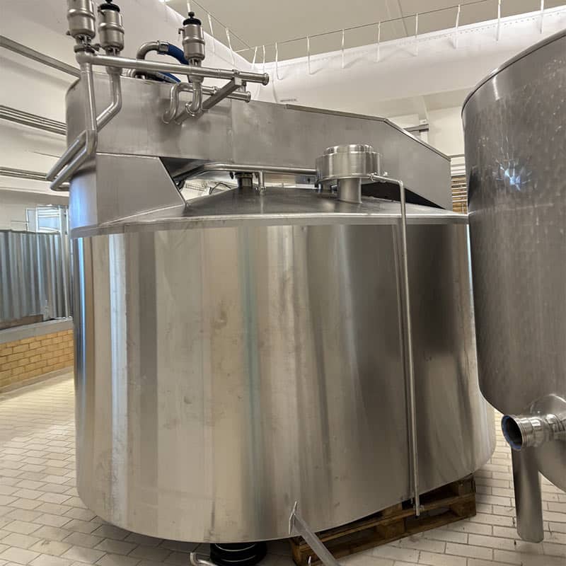 Cuve de fabrication tout inox fermée de 5000 L de capacité, marque Chalon-Mégard en excellent état. Cette cuve professionnelle complète est équipée d’un système de brassage et décaillage à lames automatique performant pour un travail optimal du caillé. Le système de désaurumage intégré permet une gestion précise de l’acidification du lait. Montée sur pieds robustes, elle assure une vidange par gravité facilitant les opérations de moulage.
