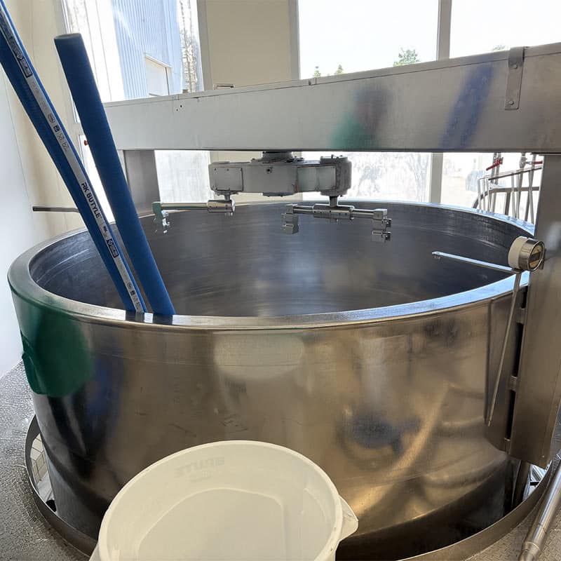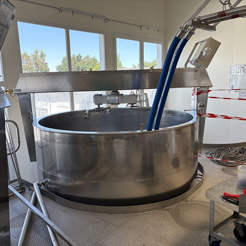 Cuve de fabrication tout inox ouverte de 5000 L de capacité, marque Chalon-Mégard en excellent état. Cette cuve professionnelle complète est équipée d’un système de brassage et décaillage efficace permettant un travail homogène du caillé lors de la phase de caillage. Sa conception ouverte facilite l’accès pour le contrôle visuel et les opérations manuelles durant le processus de fabrication.